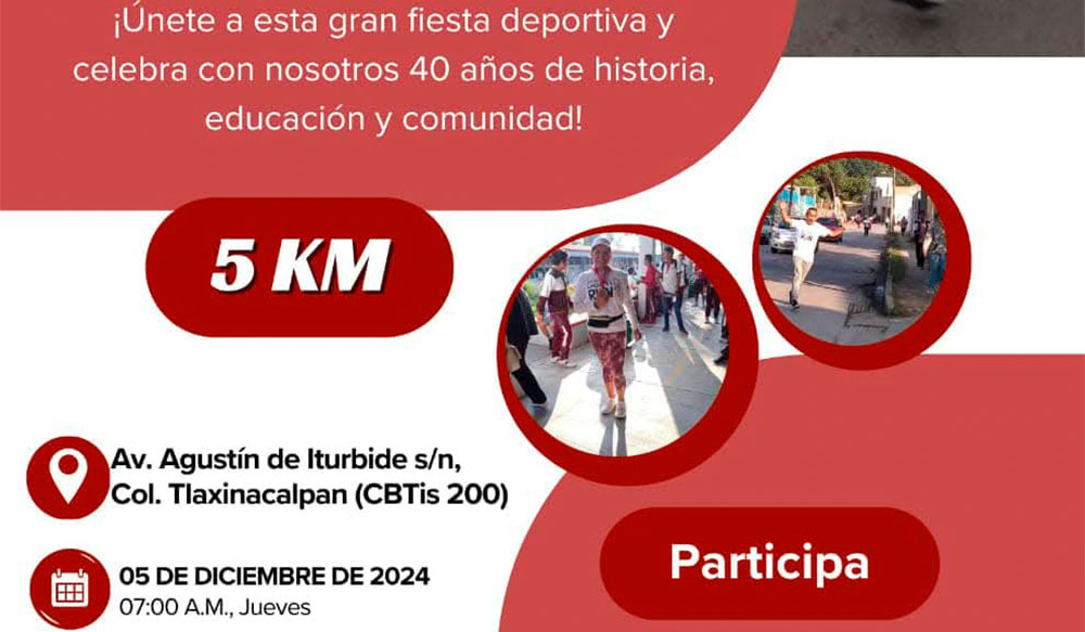 Te invitamos a la gran carrera de 5 Km con motivo del 40 Aniversario del plantel, las primeras 100 personas que crucen la meta recibirán medalla conmemorativa.