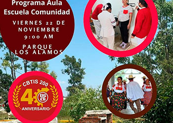 En el marco del “Programa Aula, Escuela, Comunidad”, les hacemos una cordial invitación a las actividades de fin de semestre, mismas que se llevarán a cabo el viernes 22 de noviembre a las 9:00 a.m., en el Parque de los Álamos, Colonia Tlaxinacalpan.